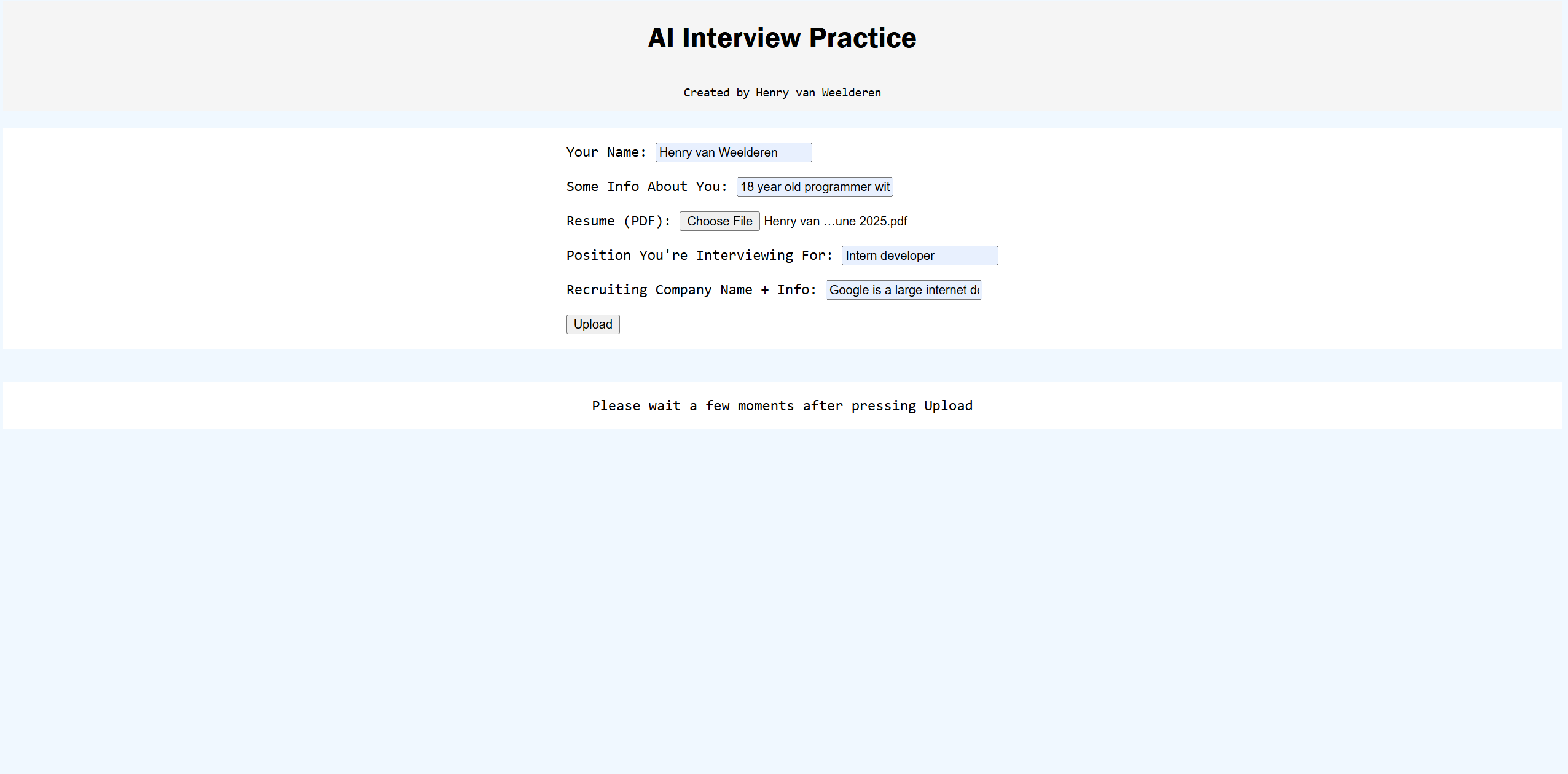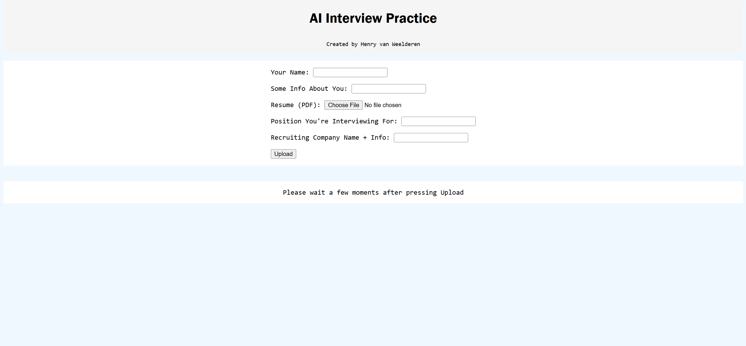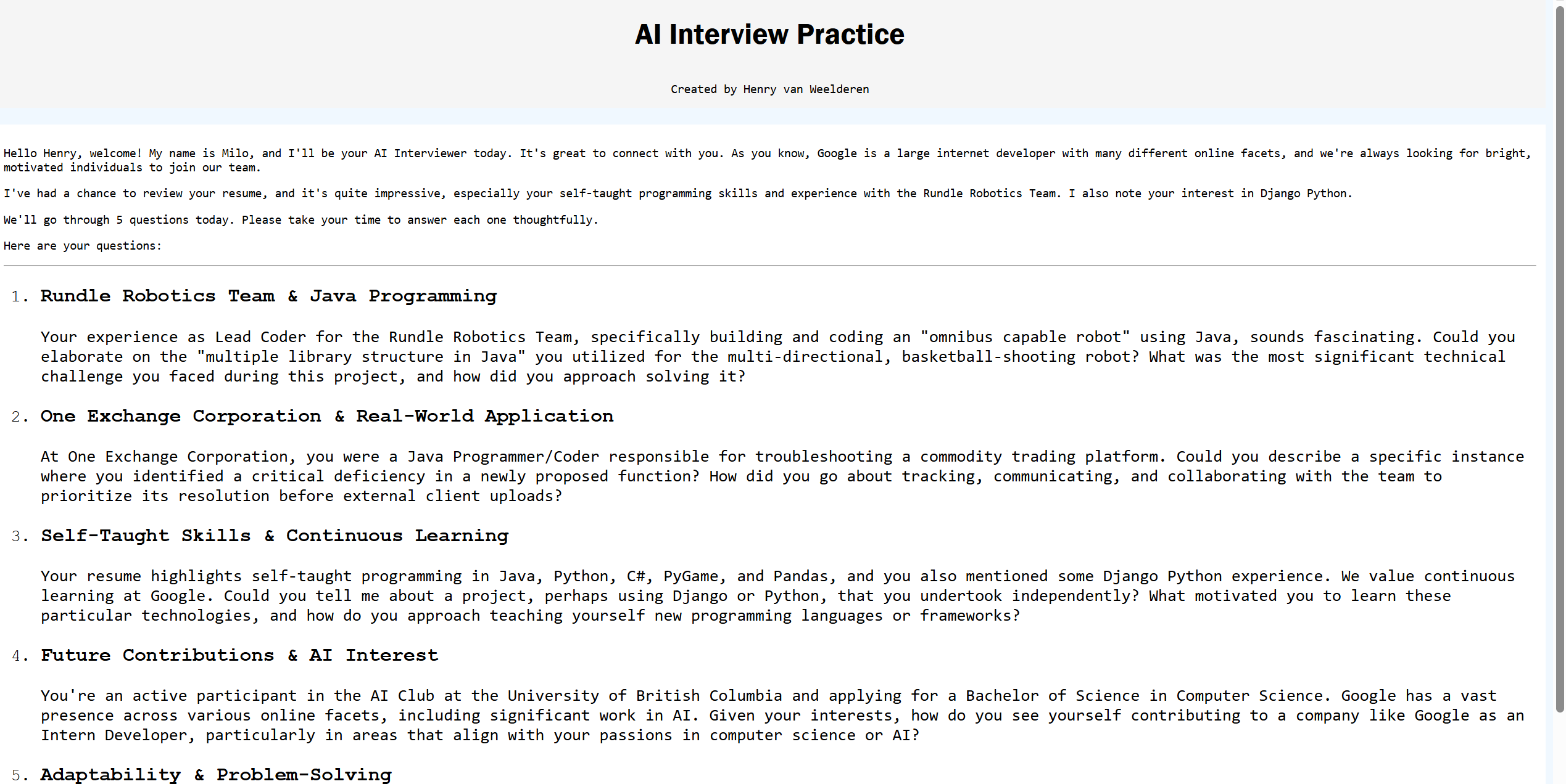 Link to Github repoWebsite that generates 5 interview questions based on given information about the user and the job/company they're applying to.